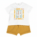 Questo completo della Collezione Estate è un inno alla spensieratezza! La maglietta bianca, con la sua stampa di un cactus che invita al viaggio, stimola la sua curiosità e lo prepara a nuove avventure. I pantaloncini color giallo ocra, morbidi e avvolgenti, lo coccolano come un caldo abbraccio.
