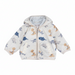 Per un look luminoso e raffinato, questa variante presenta un fondo color crema delicato su cui si muovono dinosauri nei toni del biscotto, grigio perla e blu notte. La fodera interna del cappuccio in morbido jersey grigio melange offre una sensazione rassicurante a contatto con il viso, mentre i polsini elastici trattengono il calore.