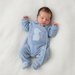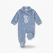 Questa tutina è un piccolo capolavoro di tenerezza. Il colore azzurro cielo, impreziosito da un motivo di stelline in rilievo, evoca sogni d'oro e avventure fantastiche. Il dolce coniglietto applicato sul davanti è un invito a coccole infinite.